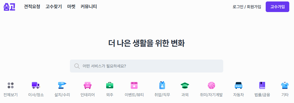 숨고는 고객과 고수를 연결하는 재능 중개 플랫폼으로 요즘에는 간단한 작업, 하루 단위의 생활도우미나 청소, 설치, 행사 알바 등 요청도 많아지고 있습니다.