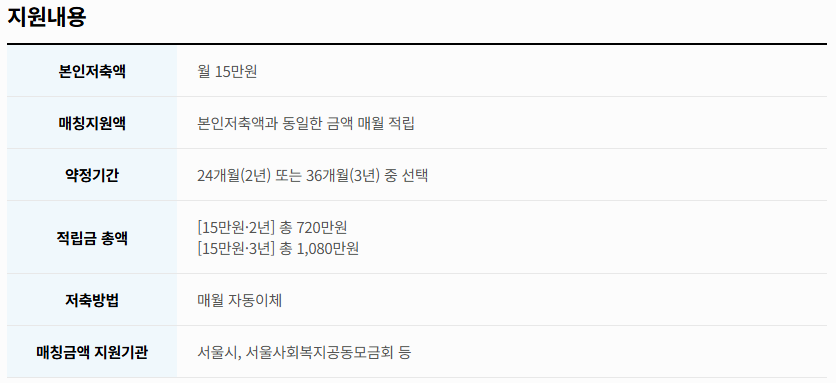 근로하는 서울시 청년이 월 15만 원을 2년 또는 3년간 저축하면 저축금액과 동일한 금액을 서울시와 시민 후원금으로 1:1 매칭 적립해줍니다.